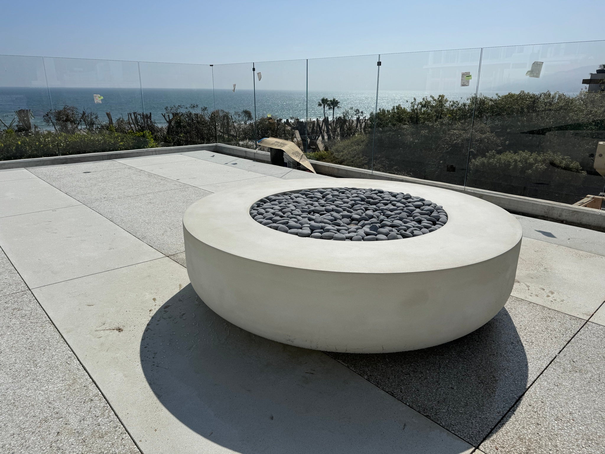 The Ocean Fire Table draws its distinctive character from a landmark installation that inspired its name. Born from a thoughtful fusion of our Cilindro Edge and Manhattan pot designs, this piece balances visual drama with refined proportions. A gently rounded base softens the silhouette while providing stable, unobtrusive support—letting the table command attention without overwhelming your space. Crafted in smooth Crystal White with a sophisticated #90 finish, it pairs seamlessly with a powerful Crossfire Burner (240K BTU) , fire glass and is topped with Rasmussen fire pebbles to create an unforgettable focal point for outdoor entertaining. Dimensions: 72" × 18" with 14" lip.